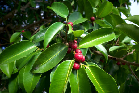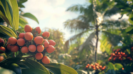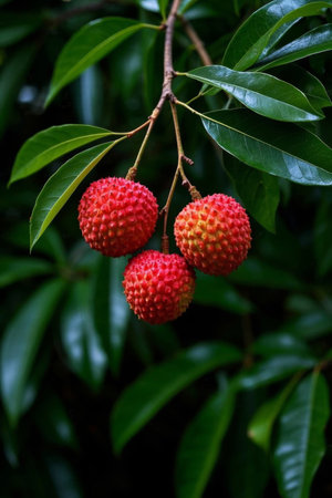 A stunning closeup of vibrant red fruits hanging from lush green foliage, showcasing the beauty of tropical nature. Perfect for fresh food themes.