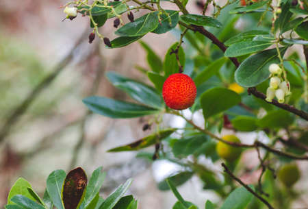 Arbutus or strawberry tree flower, leaves and fruit. Selective focus. Horizontal photography. Copy space.