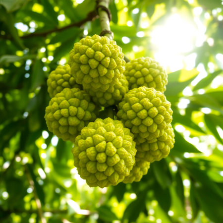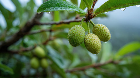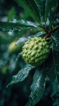 Sugar apple in gentle light rain, soft raindrops visible on vivid green leaves, natural realistic style, bright fresh colors, balanced wide composition, cinematic framing, highly detailed.
