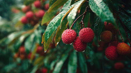 Lychee in gentle light rain, soft raindrops visible on vivid green leaves, natural realistic style, bright fresh colors, balanced wide composition, cinematic framing, highly detailed, seamless for video continuation.