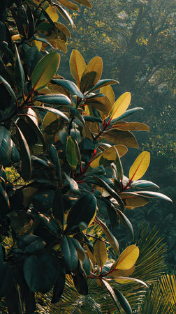 The Rubber tree in summer, Bright sunlight pierces dense foliage, the air feels hot, natural.
