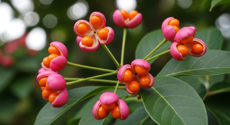 A close up showcasing the clustered berries of a curry tree. The foliage surrounds the vibrant pink berries creating a contrast of textures and colors. A great image for botanical illustrations, food photography and nature themed projects.
