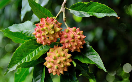 Exotic and tropical fruit of red color with multiple balls forming an agglomeration