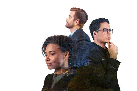 Double exposure of three young, successful, business people, man and woman, standing in front of Asian city Bangkok background. Concept of hard work and study. Modern life way. Night time.