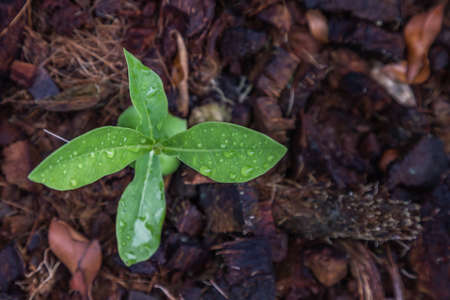 A young plant emerges from rich soil, showcasing vibrant green leaves. This image captures the essence of nature's renewal and growth, perfect for environmental themes.