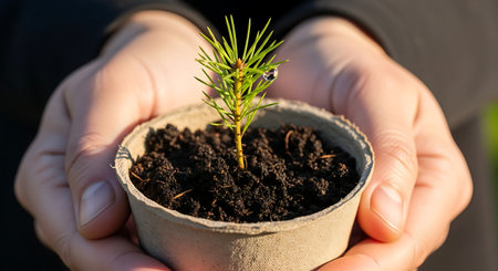 Close-up of small green pine tree sapling growing in peat pot. Hands carefully hold young plant with soil, promoting nature conservation. Seedling ready for planting.