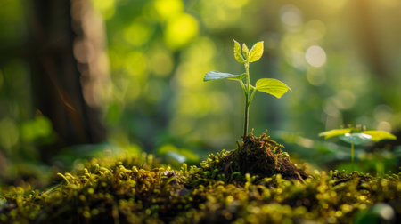 Close-up of a young plant sprouting from moss in a lush forest, representing nature, growth, and environmental sustainability.