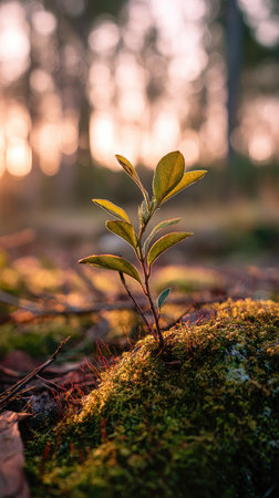 Photo of a young plant growing on moss at sunrise, symbolizing hope and new beginnings.