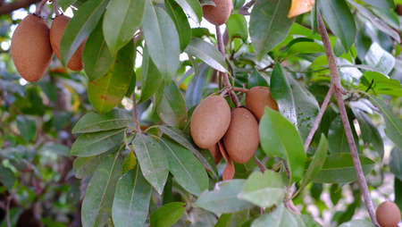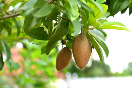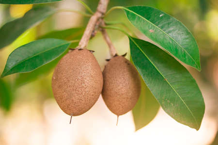 Growing Sapodilla fruit with branches and leaves in the garden on tree
