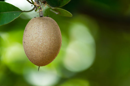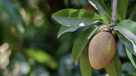 Fruit (ellipsoid berry) of Manilkara zapota, sapodilla on tree. Selective focus on fruit. Dappled sunlight in background. Copy space