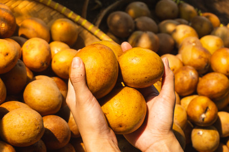 harvesting sapodilla fruit (manilkara zapota) has other name sawo, sapota, sweet tasting fruit grow in tropical climate, taken in golden hour