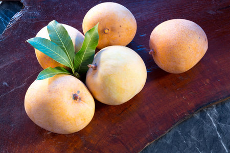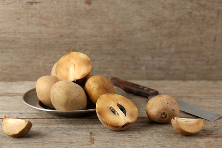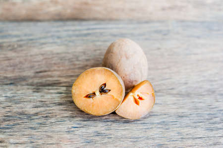 Sapodilla fruits on wooden background. Fresh sapodilla fruit.