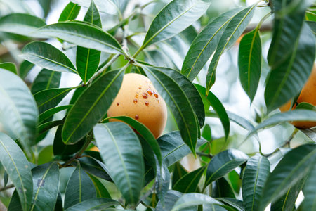 Fruit (ellipsoid berry) of Manilkara zapota, sapodilla on tree. Selective focus on fruit