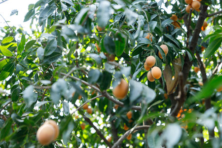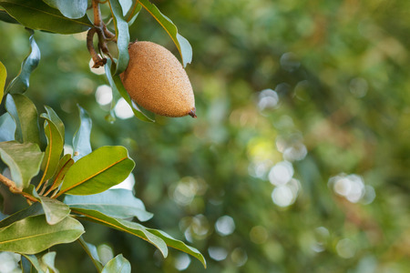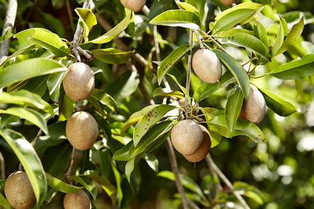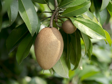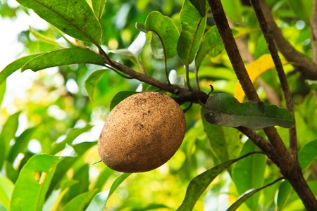 Sapodilla on tree in an organic garden. Other names - Lamut in Thailand. Sapodilla is a tropical, evergreen tree fruit (berry) with exceptionally sweet and malty flavor.