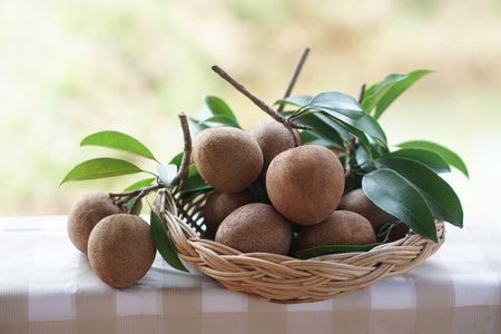 Fresh organic sapodilla fruits on basket and wooden floor. Concept, tropical fruits with soft brown peel, sweet and delicious. Agriculture crops with medicinal qualification