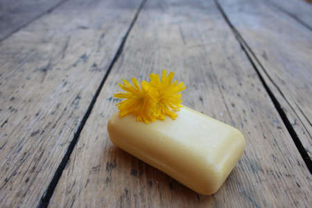 Natural soap on a yellow background. Flat lay the concept of Spa cleanliness of hands copy space