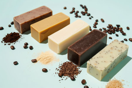 Five unique bars of soap are carefully displayed on a light blue surface, surrounded by various coffee grounds and powder for a contrasting look.