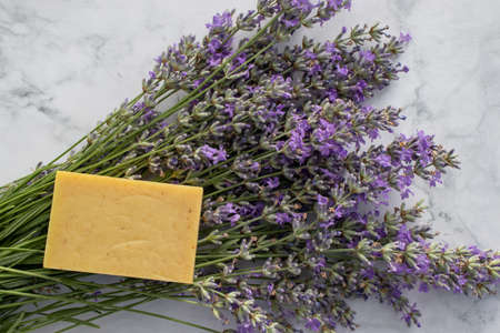 Lavender soap bar and lavender flowers on white marble table background. Beauty and self care concept. Top view, flat lay, copy space