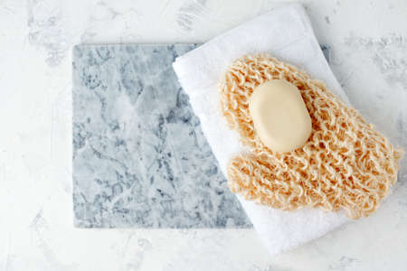 Handmade soap and loofah sponges on a beige background. Eco lifestyle concept.