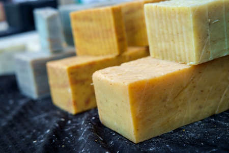 Lump hand soap. Hygiene and prevention of viral diseases concept. Variety of colorful natural soap bars, close-up, selective focus.