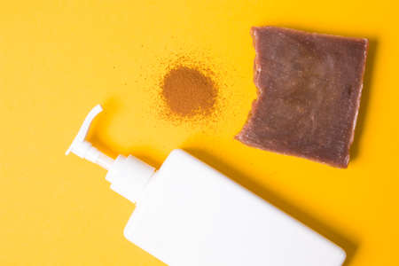 white bottle with dispenser without a label, a heap of ground coffee, a piece of natural homemade brown cocoa soap on a yellow background, natural body care at home