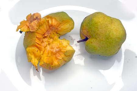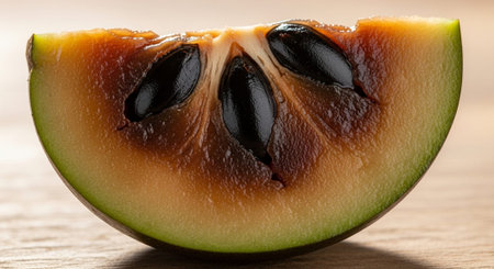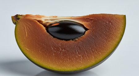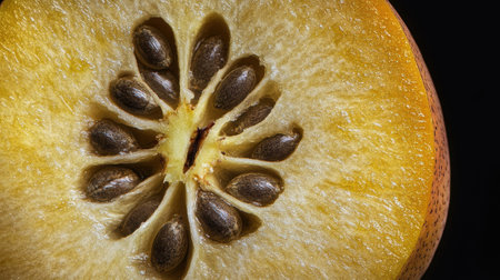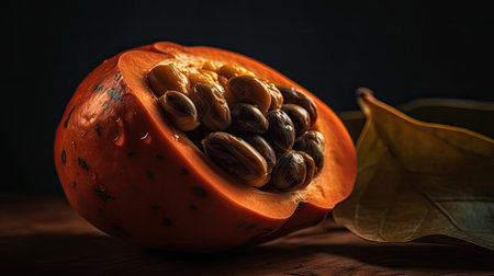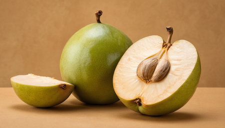 A captivating 3D illustration of a bael fruit. partially sliced open to reveal its intricate seeds. Perfect for illustrating articles on tropical fruits. Asian cuisine. or the benefits of bael.