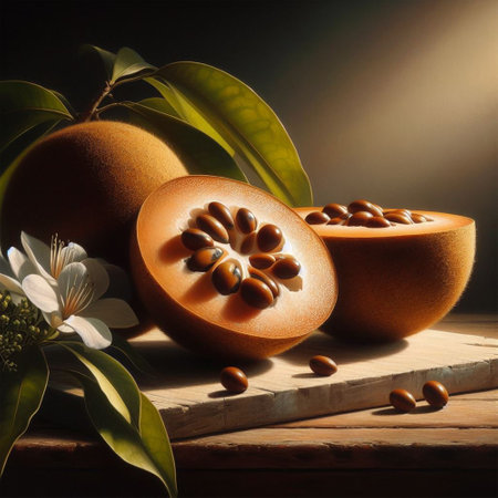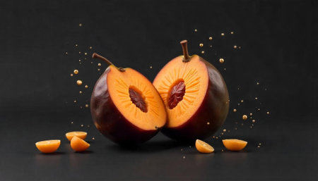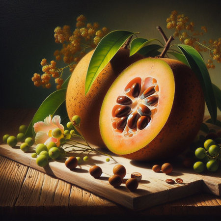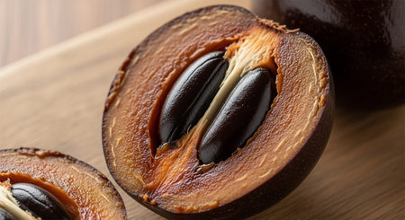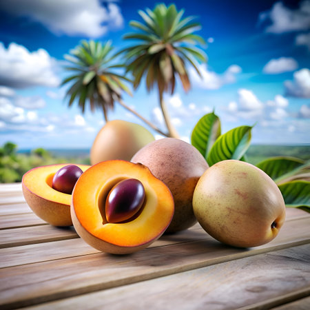 A 3D illustration of a lucuma fruit. showcasing its vibrant yellow flesh and purple seeds. The fruit is placed on a wooden table with palm trees and blue sky in the background. offering a tropical. exotic feel.