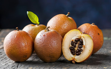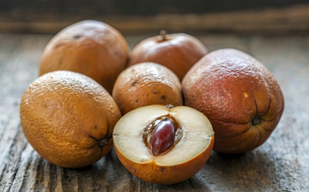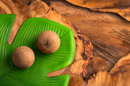 fresh sapodilla fruits on old wooden background. tropical fruits concept