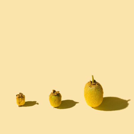 Three whole kiwi fruits in different development phases. Concept for maturing of fruits. Beige background with sunny shadows.