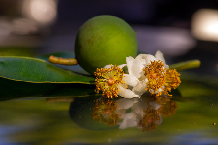 Calophyllum inophyllum flower, fruit and green leaf, a large evergreen plant, commonly called mastwood, beach calophyllum, shallow focus