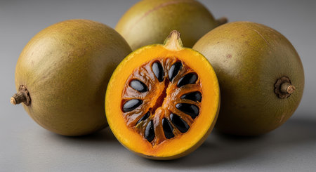 Lúcuma fruit displayed with seeds and brown skin on neutral background