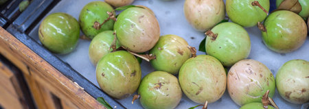 Panorama pile of Star apple Vietnamese fruit or Vu Sua at grocery store shelf in Hanoi, Vietnam, fresh harvested kenitu, caimito, tropical family of the Sapotaceae. Asia