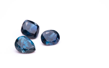 Three blue gemstones are arranged on a white background. The stones are of different shapes and sizes, but they all have a blue hue. The arrangement of the stones creates a sense of harmony