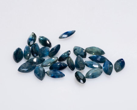 Scattered Collection of Polished Blue Sapphire Gemstones on White Surface.
