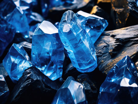 A Blue crystal rocks create stunning, textured background, showcasing various shapes and sizes. deep blue hues evoke sense of calm and tranquility, perfect for design projects