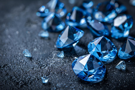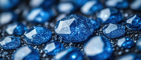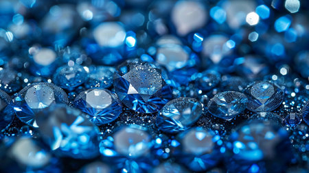 Blue gemstone background, scattered, various sizes, shiny surface, dark backdrop. Ideal for website design, advertising, or luxury product packaging.