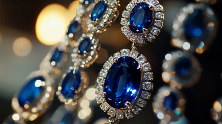 Elegant chandelier earrings with a cascade of oval-cut blue sapphires and small diamonds generative ai