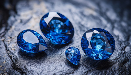 A Set of Faceted Blue Sapphires of Different Sizes and Cuts on a Dark Rock Background.