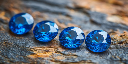 Four Brilliant Blue Sapphire Gemstones on Textured Wood, Displaying Deep Color and Sparkle