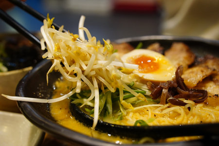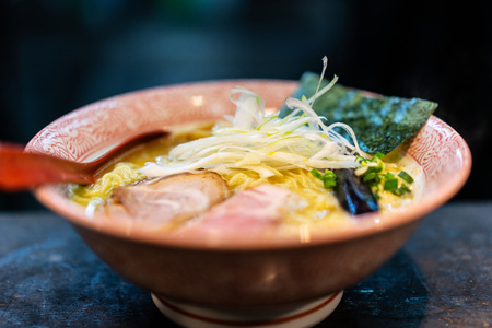 Close up view of traditional Japan ramen, Tonkotsu ramen with pork bone based soup