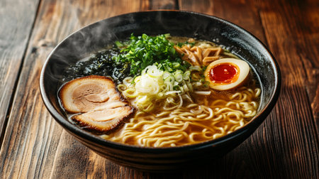 A steaming bowl of ramen on a wooden table