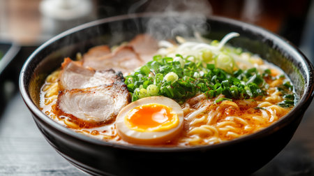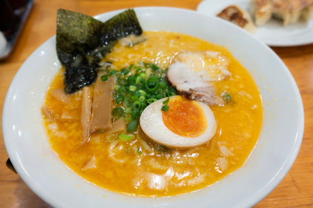 Delicious ramen, a Japanese noodle dish that consists of Chinese-style wheat noodles served in a meat-based broth, often flavored with soy sauce or miso, and uses toppings such as