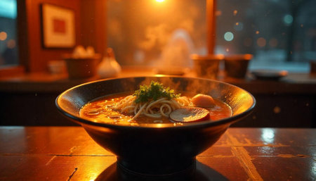 Detailed cozy restaurant with warm lighting and neutral color palette serving realistic ramen soup. No customers closeup. Generative AI Generated