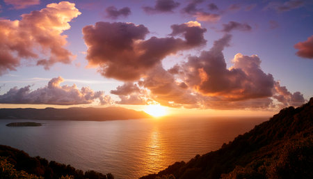 Gorgeous picturesque landscape of seashore with hills, sun is shining, sunrise