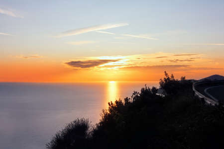 Sunset visible from a hill, light reflected in the water of Mediterranean sea in Cinque Terre, Italy