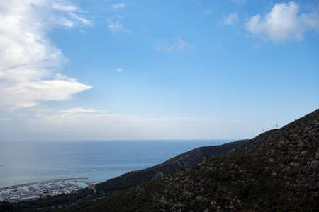 Landscape of the rocky mountains of the Castelldefels Natural Park and its beach with the calm sea and the sky covered with clouds in the morning.