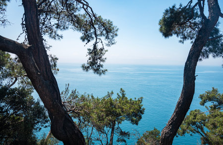 View of the Black Sea and pine trees on a sunny summer day. Turkey, Princess Islands.