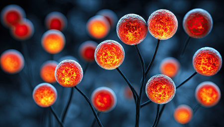 This image presents an abstract illustration featuring numerous spherical structures. They exhibit vibrant orange and red hues. The composition suggests an organic environment. The artwork incorporates a dark background, creating a visual contrast. Suitable for educational, scientific, or conceptual projects, it may be utilized in various commercial or editorial contexts.