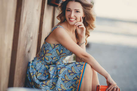 Happy woman, beautiful model brunette with long curly hair and brown eyes, a beautiful smile, in a blue summer dress, jewellery, sitting alone on a bench near the wooden fence outdoors