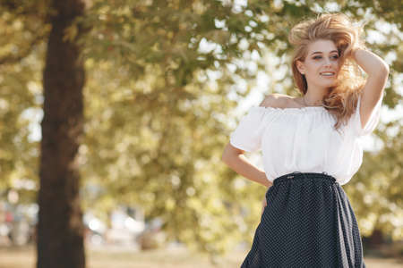 Young beautiful blonde caucasian woman is walking in a summer park. Young attractive woman with perfect smile, summer outdoor portrait. Charming cheerful girl smiles and looks into the camera.
